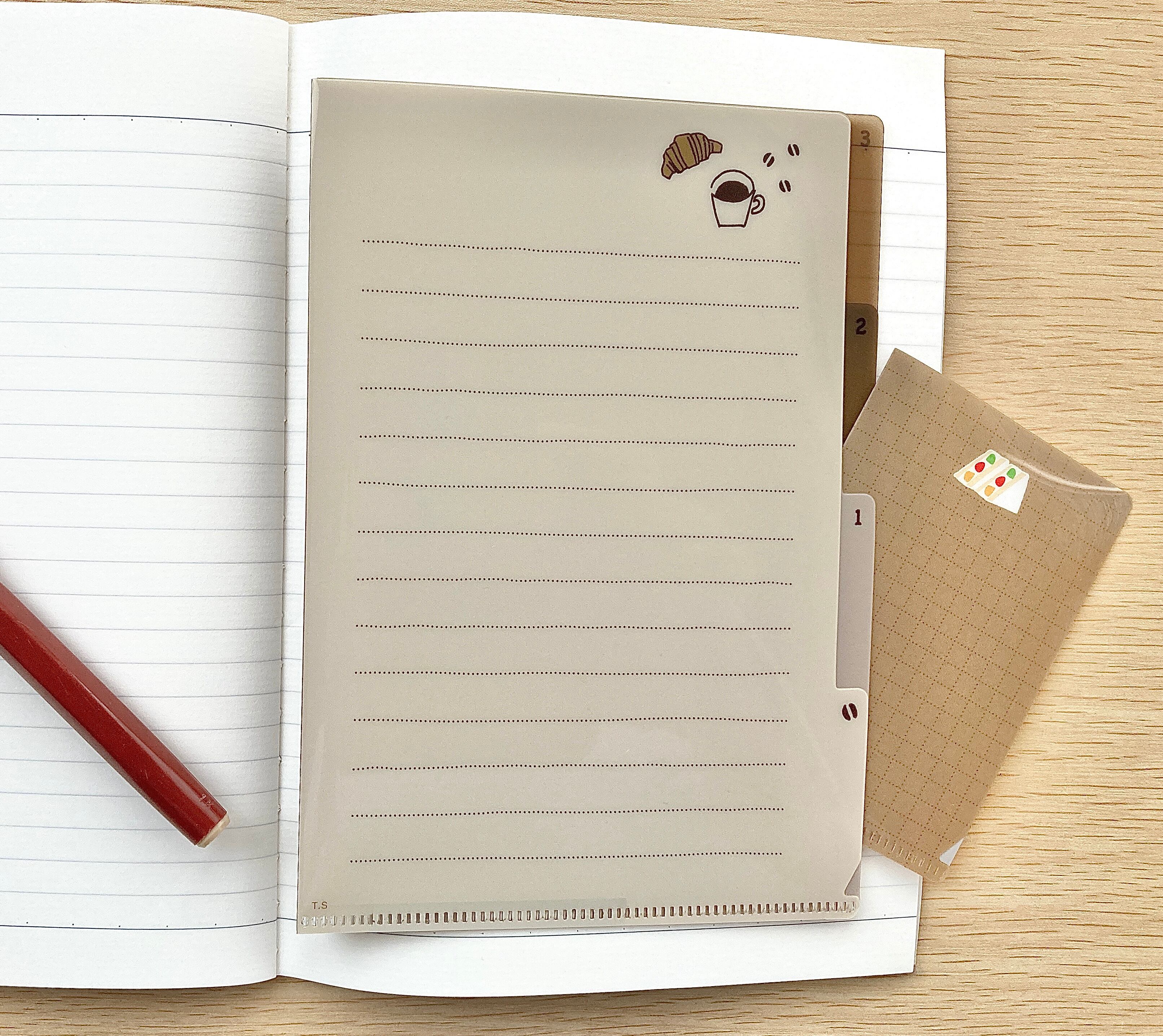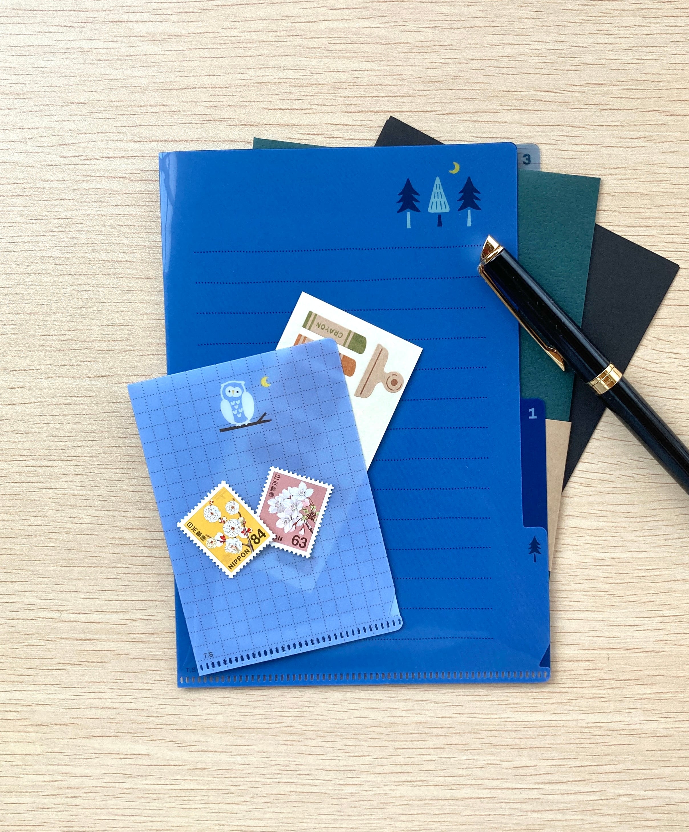 B6サイズの3ポケットクリアファイルと、ちびクリアファイルの2枚セットです。夜空とフクロウが可愛い「ツリー」の他に、クロワッサンとコーヒーに、美味しそうなフルーツサンドのイラストの「パンとコーヒー」も新登場!