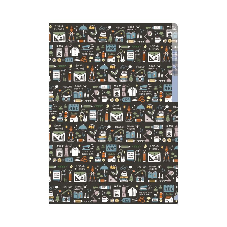 黒地のデザインに沢山のイラストが描かれていて、見ていて飽きない。ワクワクするクリアホルダーです。