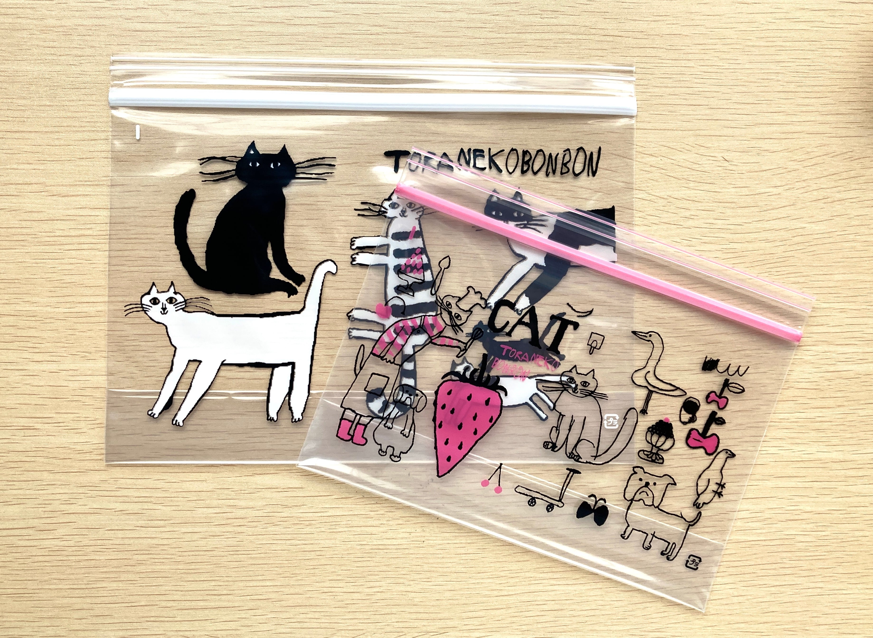 トラネコボンボンさんのイラストが可愛いフリーザーバッグ。こちらはMサイズの3枚セットです。(ピンクはSサイズ)